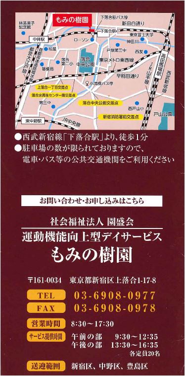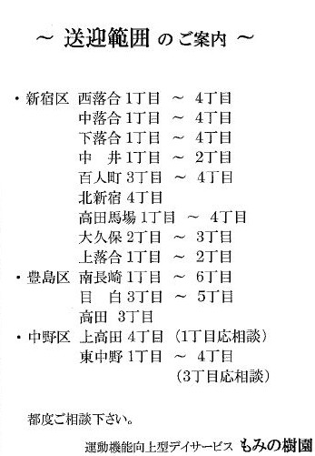 区内在住の生活介護事業を利用されている方で、新宿区地域生活支援サービス受給者証(土曜ケアサポート事業に支給決定が ... にて西落合1丁目下車 徒歩5分 ○JR目白駅より丸山営業所行バスまたは江古田2丁目行バスにて 西落合1丁目下車 徒歩5分 ... |